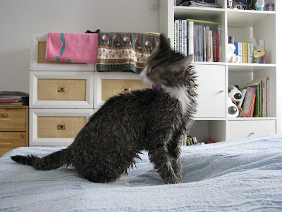 Nyt on jo kevättä ilmassa. Ikkunaltakin on hitaasti sulanut lumi, että näkee jo uloskin, eikä tarvii kurkkia. Auringon paistetta ihaillaan keittiön ikkunasta, Evakin tuossa köllöttelee hienon tilaustyönä teetetyn makuualustan päällä. :) Pötköllä on vanhat ja tutut harrastukset: veden vahtiminen lavuaarissa ja vessaeliöiden saalistus. Tiikerin titteli on pysynyt vahvana! Evakin on melkein aina mukana. Yhdessä ne kurkkivat ja vahtivat vessalaattojen väleissä luikertelevia siiroja, vai mitä ovatkaan. Pieniä mustia ötökköjä. Aina korvat höröllä ja jos sellainen jossakin menee, niin molemmat hyökkäävät perään ennen kuin ehdit edes kissaa sanoa. Nyt ne on saaneet viettää aikaa paljon keskenään :) Nimittäin emäntä on menossa ja kissahoitaja käy joka päivä ruokkimassa, hoitamassa ja leikittämässä kisuja. Voin vaan kuvitella, miltä koti näyttää, kun tulen takaisin. Matot rullalla, oksennusta kengissä, hiekkalaatikko täynnä, ruuat on syöty.. ehkä on kirjahyllystä tiputeltu jotakin, viimeksi taisi olla joku koru lentänyt lattialle.